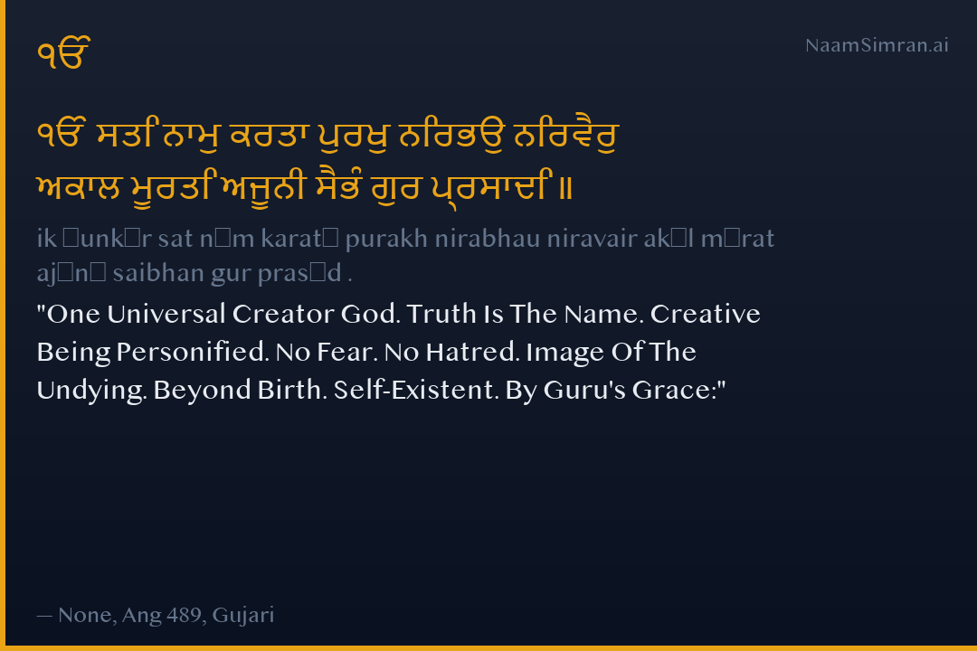 ੴ ਸਤਿ ਨਾਮੁ ਕਰਤਾ ਪੁਰਖੁ ਨਿਰਭਉ ਨਿਰਵੈਰੁ ਅਕਾਲ ਮੂਰਤਿ ਅਜੂਨੀ ਸੈਭੰ ਗੁਰ ਪ੍ਰਸਾਦਿ ॥