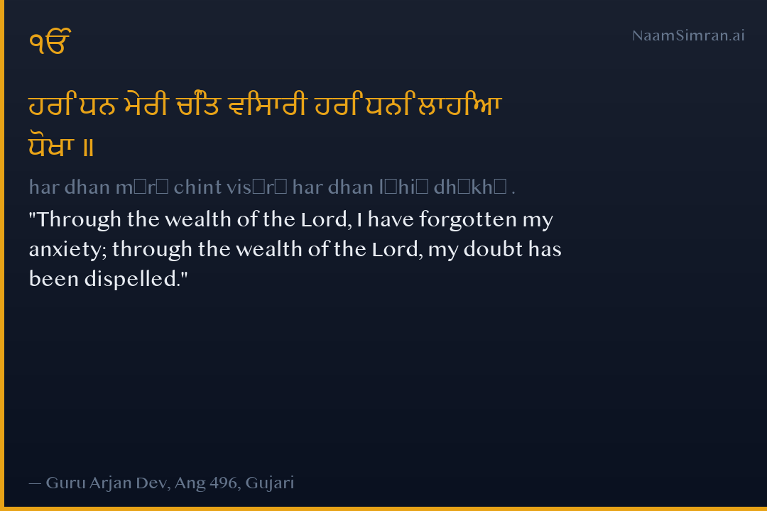 ਹਰਿ ਧਨ ਮੇਰੀ ਚਿੰਤ ਵਿਸਾਰੀ ਹਰਿ ਧਨਿ ਲਾਹਿਆ ਧੋਖਾ ॥