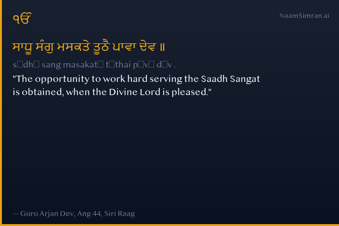 The opportunity to work hard serving the Saadh Sangat is obtained, when the Divine Lord is pleased.