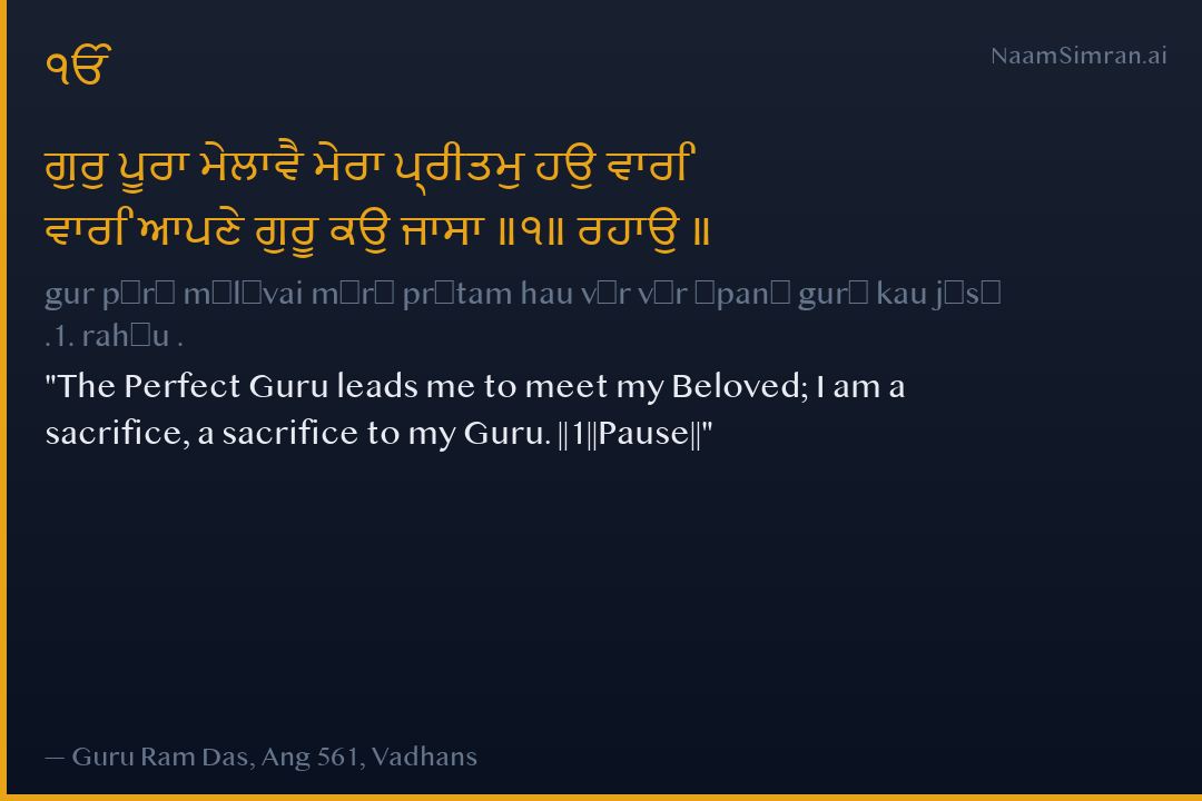 ਗੁਰੁ ਪੂਰਾ ਮੇਲਾਵੈ ਮੇਰਾ ਪ੍ਰੀਤਮੁ ਹਉ ਵਾਰਿ ਵਾਰਿ ਆਪਣੇ ਗੁਰੂ ਕਉ ਜਾਸਾ ॥੧॥ ਰਹਾਉ ॥