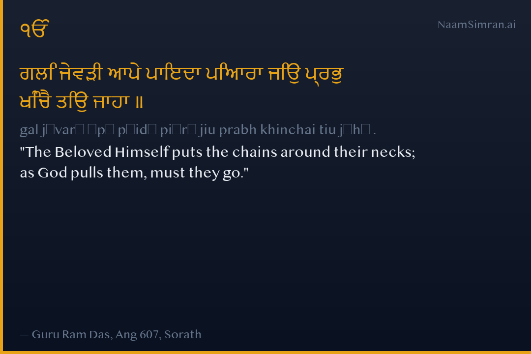 ਗਲਿ ਜੇਵੜੀ ਆਪੇ ਪਾਇਦਾ ਪਿਆਰਾ ਜਿਉ ਪ੍ਰਭੁ ਖਿੰਚੈ ਤਿਉ ਜਾਹਾ ॥