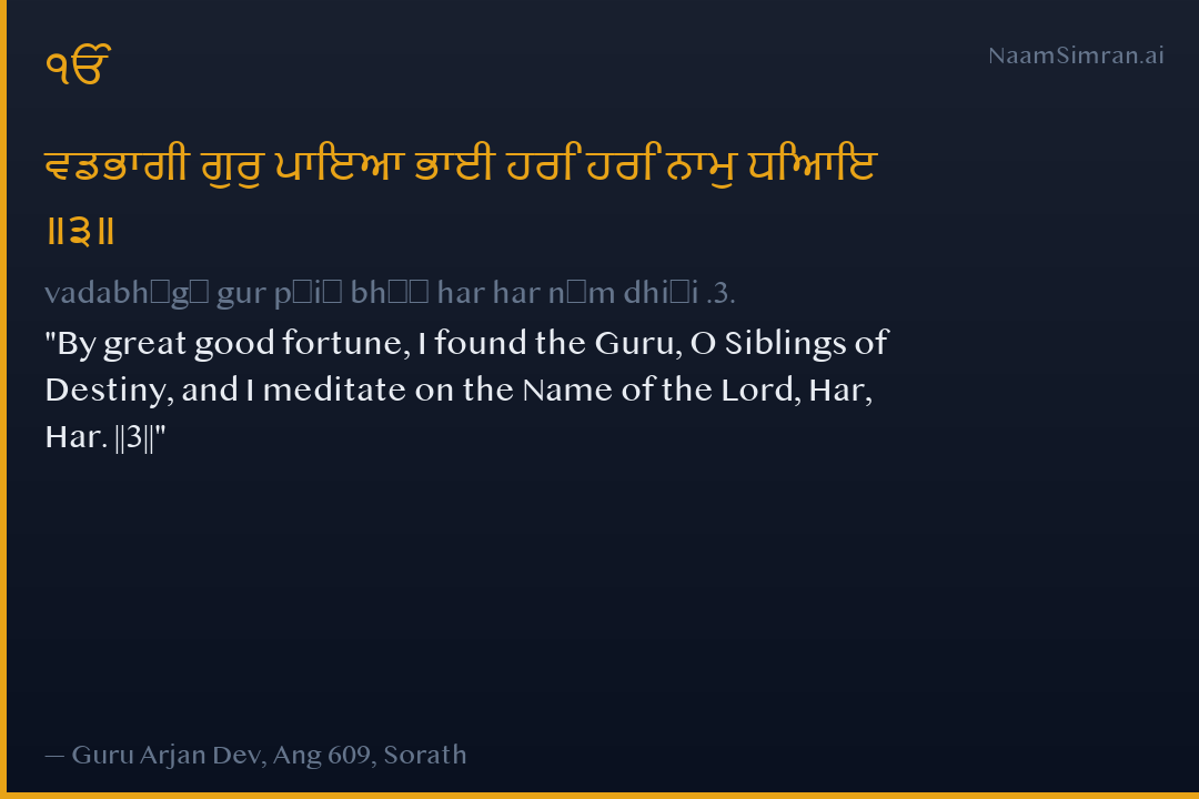By great good fortune, I found the Guru, O Siblings of Destiny, and I meditate on the Name of the Lord, Har, Har. ||3||