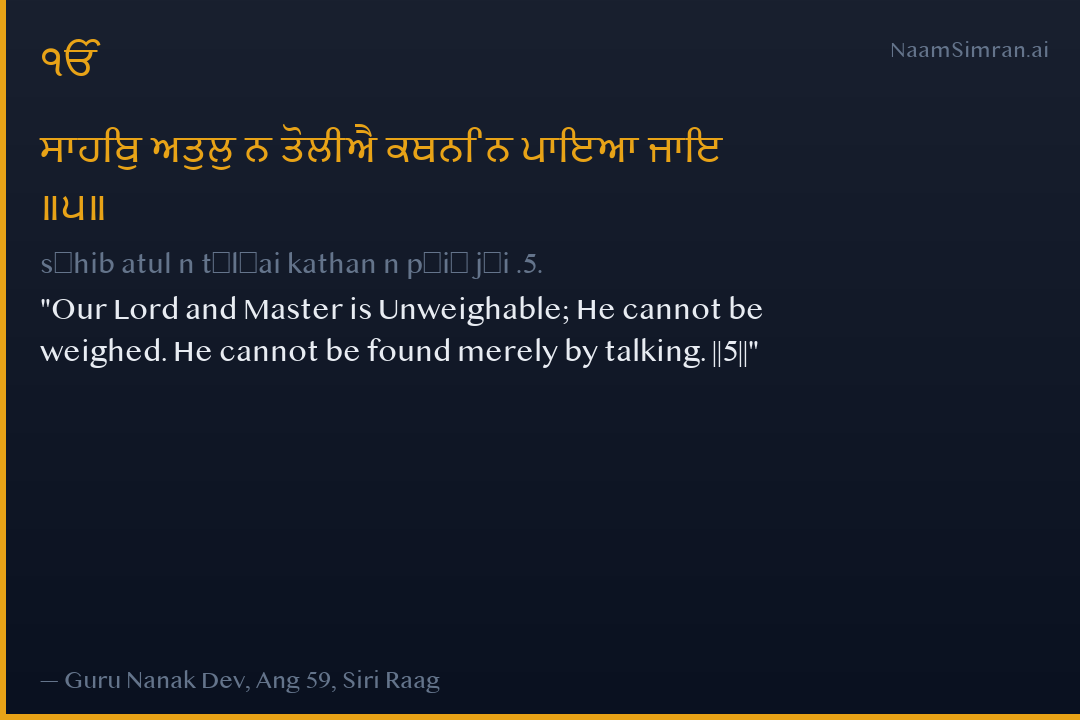 ਸਾਹਿਬੁ ਅਤੁਲੁ ਨ ਤੋਲੀਐ ਕਥਨਿ ਨ ਪਾਇਆ ਜਾਇ ॥੫॥