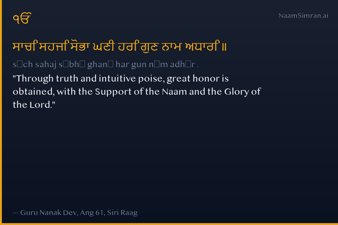 Through truth and intuitive poise, great honor is obtained, with the Support of the Naam and the Glory of the Lord.