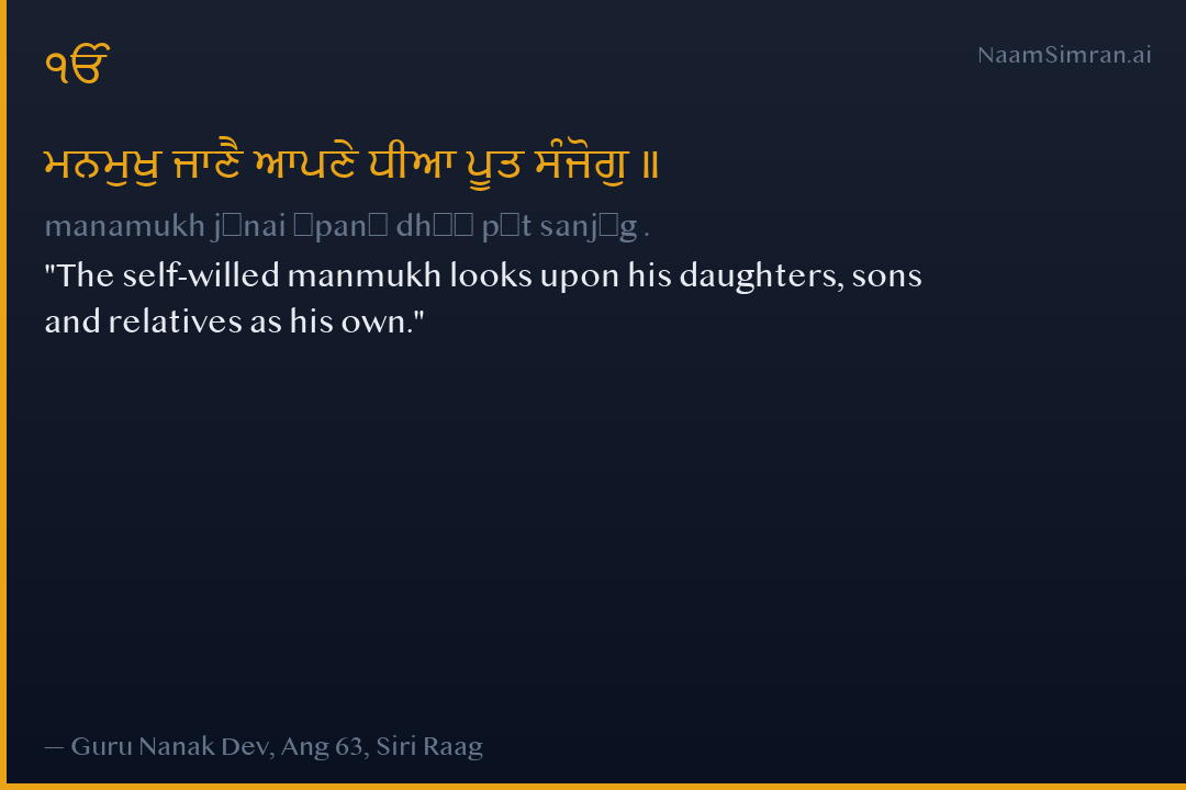 ਮਨਮੁਖੁ ਜਾਣੈ ਆਪਣੇ ਧੀਆ ਪੂਤ ਸੰਜੋਗੁ ॥