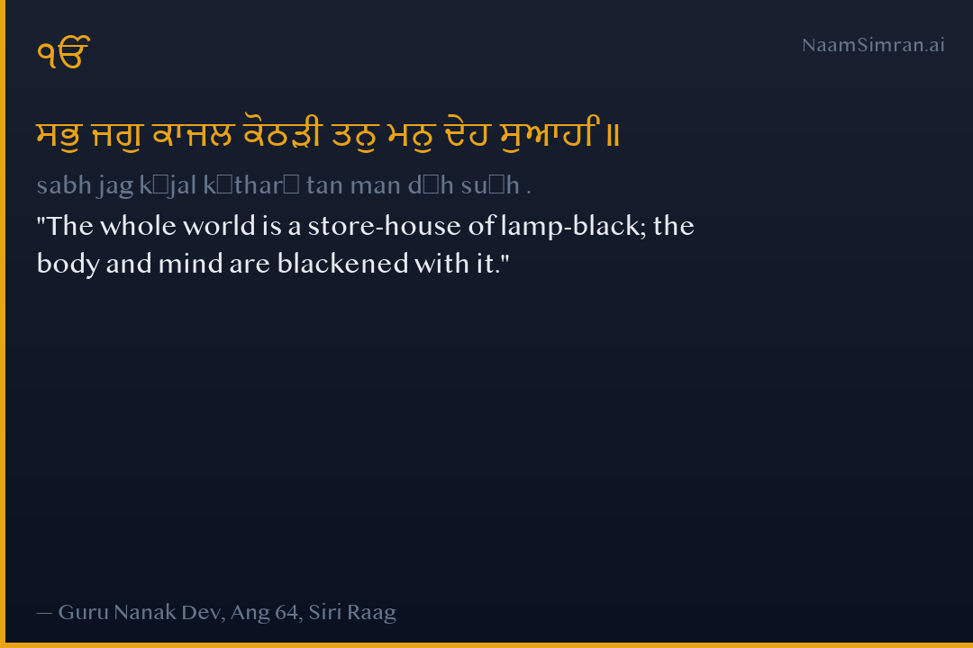 ਸਭੁ ਜਗੁ ਕਾਜਲ ਕੋਠੜੀ ਤਨੁ ਮਨੁ ਦੇਹ ਸੁਆਹਿ ॥