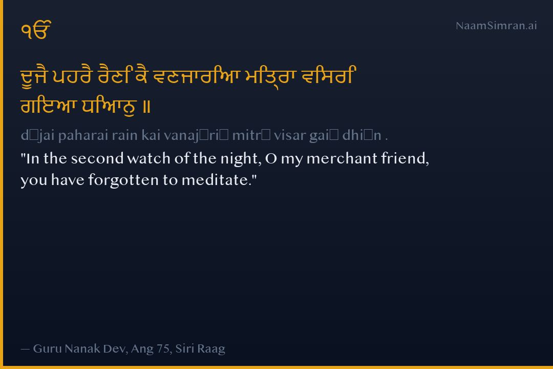 ਦੂਜੈ ਪਹਰੈ ਰੈਣਿ ਕੈ ਵਣਜਾਰਿਆ ਮਿਤ੍ਰਾ ਵਿਸਰਿ ਗਇਆ ਧਿਆਨੁ ॥
