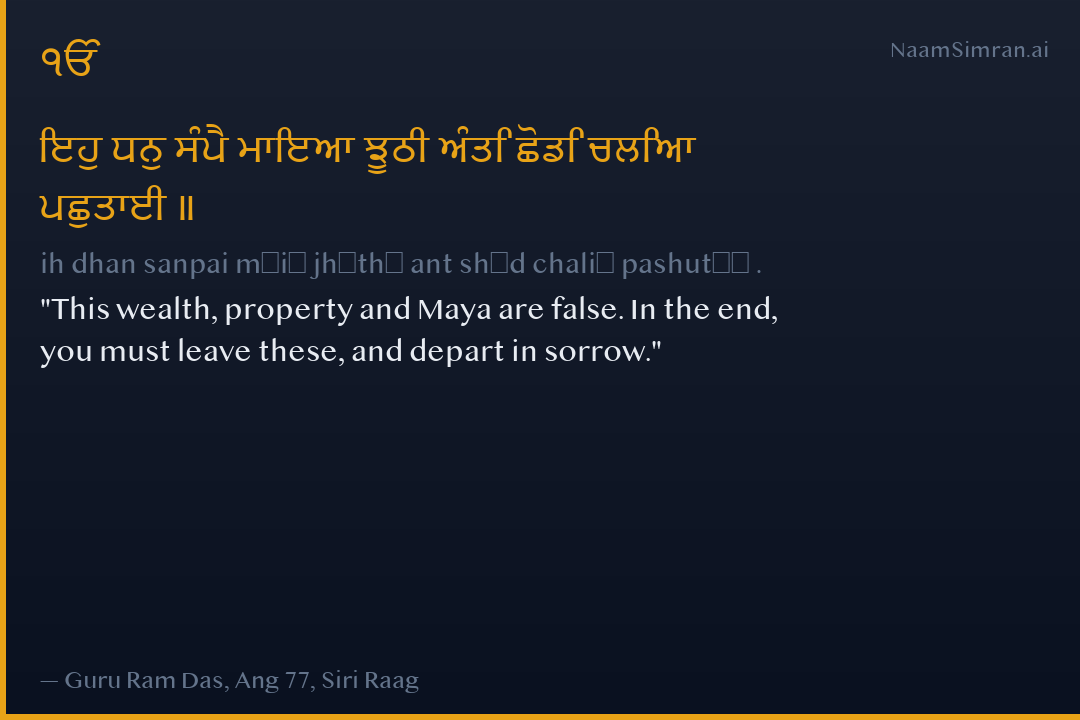 ਇਹੁ ਧਨੁ ਸੰਪੈ ਮਾਇਆ ਝੂਠੀ ਅੰਤਿ ਛੋਡਿ ਚਲਿਆ ਪਛੁਤਾਈ ॥