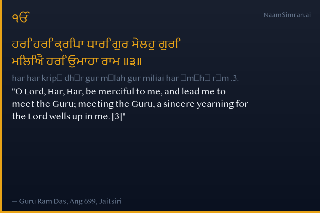 O Lord, Har, Har, be merciful to me, and lead me to meet the Guru; meeting the Guru, a sincere yearning for the Lord wells up in me. ||3||