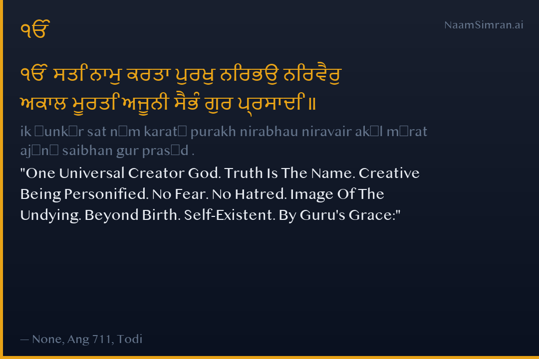 ੴ ਸਤਿ ਨਾਮੁ ਕਰਤਾ ਪੁਰਖੁ ਨਿਰਭਉ ਨਿਰਵੈਰੁ ਅਕਾਲ ਮੂਰਤਿ ਅਜੂਨੀ ਸੈਭੰ ਗੁਰ ਪ੍ਰਸਾਦਿ ॥