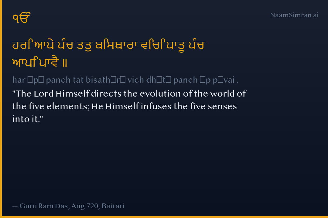ਹਰਿ ਆਪੇ ਪੰਚ ਤਤੁ ਬਿਸਥਾਰਾ ਵਿਚਿ ਧਾਤੂ ਪੰਚ ਆਪਿ ਪਾਵੈ ॥