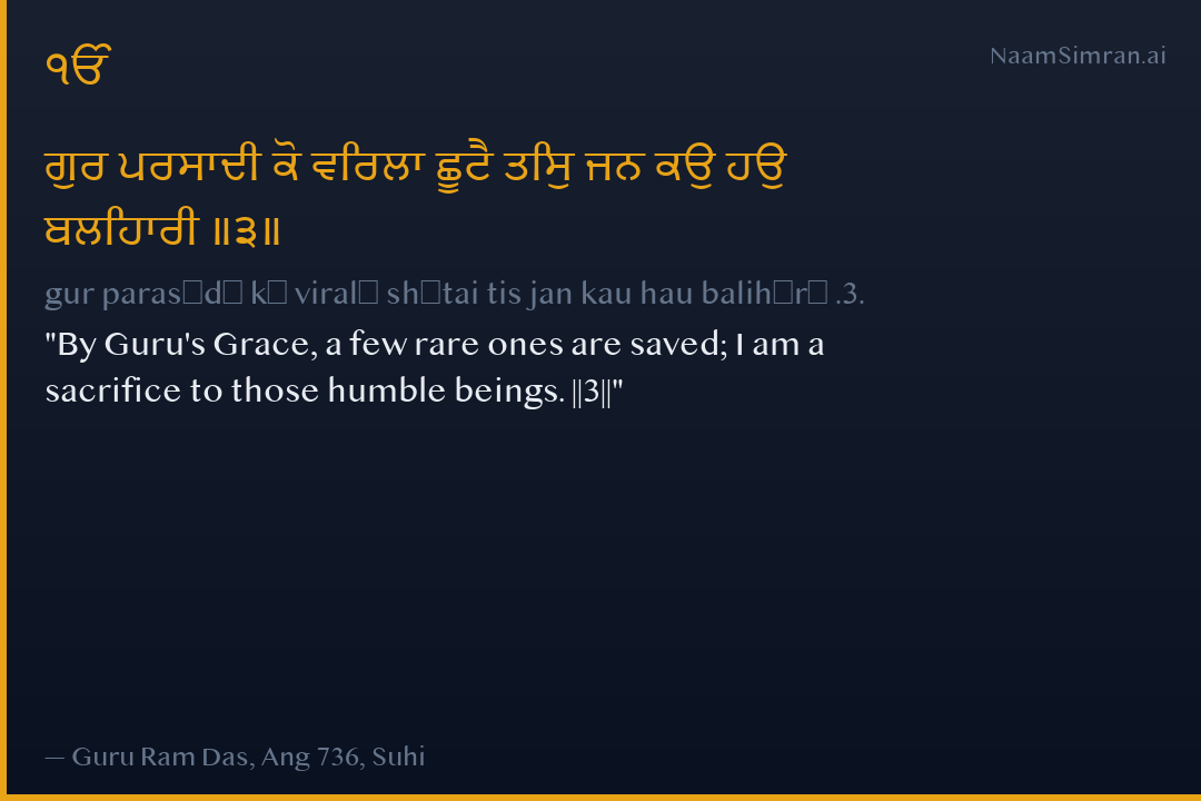By Guru's Grace, a few rare ones are saved; I am a sacrifice to those humble beings. ||3||