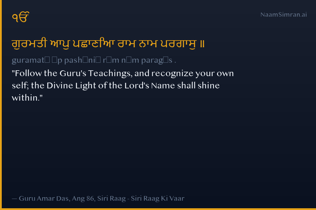 Follow the Guru's Teachings, and recognize your own self; the Divine Light of the Lord's Name shall shine within.