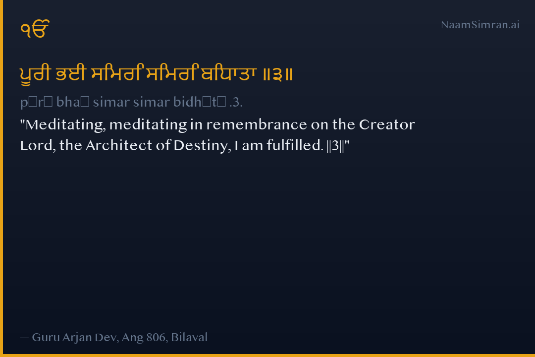 Meditating, meditating in remembrance on the Creator Lord, the Architect of Destiny, I am fulfilled. ||3||