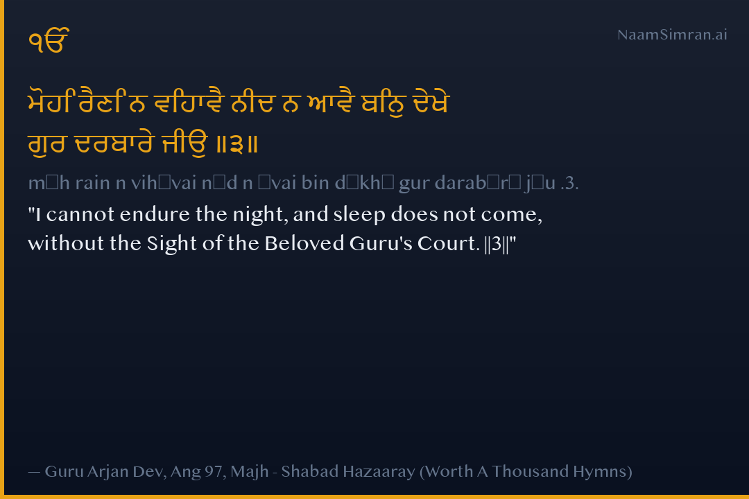 ਮੋਹਿ ਰੈਣਿ ਨ ਵਿਹਾਵੈ ਨੀਦ ਨ ਆਵੈ ਬਿਨੁ ਦੇਖੇ ਗੁਰ ਦਰਬਾਰੇ ਜੀਉ ॥੩॥