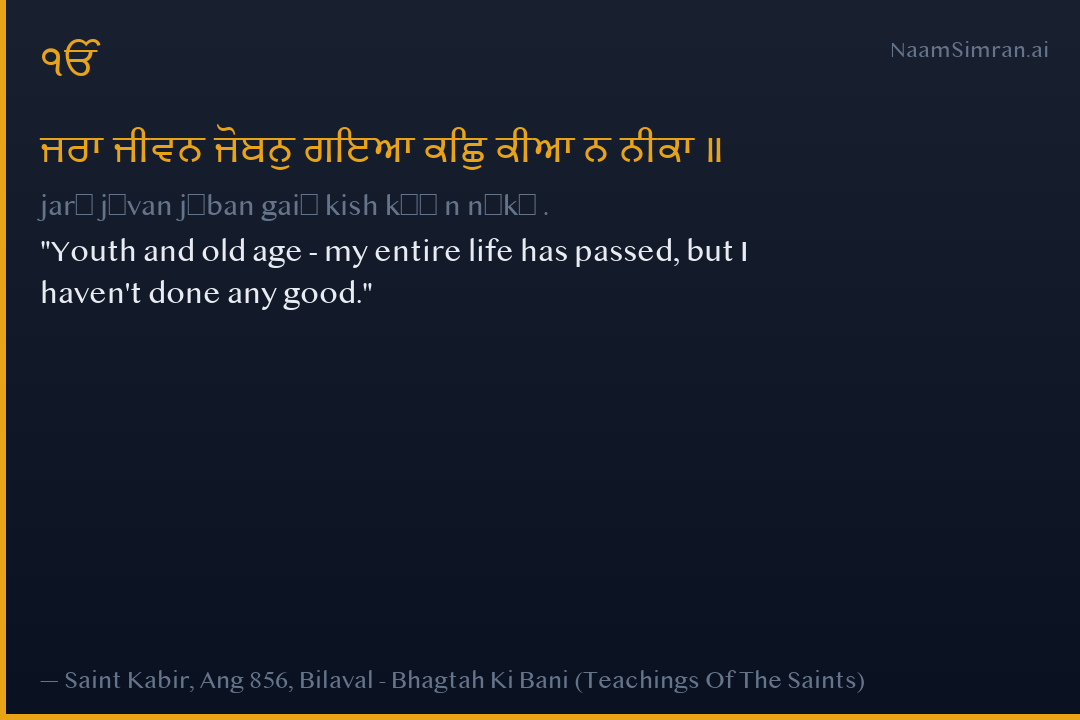 ਜਰਾ ਜੀਵਨ ਜੋਬਨੁ ਗਇਆ ਕਿਛੁ ਕੀਆ ਨ ਨੀਕਾ ॥
