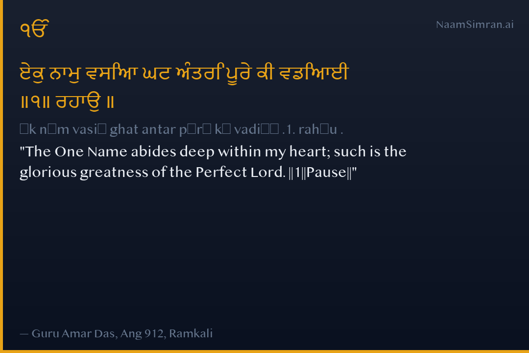 The One Name abides deep within my heart; such is the glorious greatness of the Perfect Lord. ||1||Pause||
