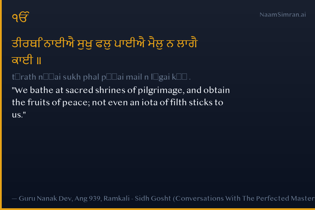 ਤੀਰਥਿ ਨਾਈਐ ਸੁਖੁ ਫਲੁ ਪਾਈਐ ਮੈਲੁ ਨ ਲਾਗੈ ਕਾਈ ॥