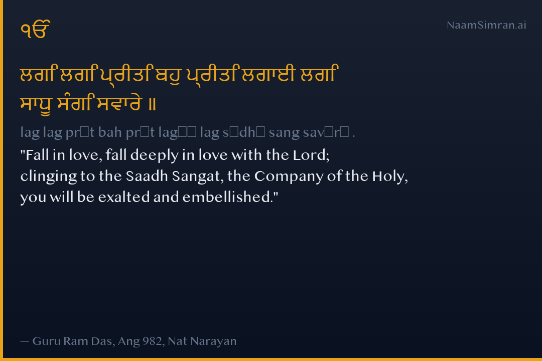 Fall in love, fall deeply in love with the Lord; clinging to the Saadh Sangat, the Company of the Holy, you will be exalted and embellished.