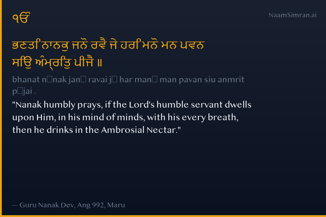 ਭਣਤਿ ਨਾਨਕੁ ਜਨੋ ਰਵੈ ਜੇ ਹਰਿ ਮਨੋ ਮਨ ਪਵਨ ਸਿਉ ਅੰਮ੍ਰਿਤੁ ਪੀਜੈ ॥