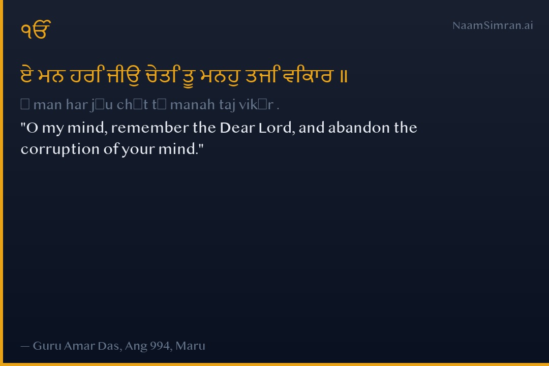 ਏ ਮਨ ਹਰਿ ਜੀਉ ਚੇਤਿ ਤੂ ਮਨਹੁ ਤਜਿ ਵਿਕਾਰ ॥