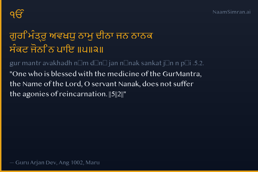 gur mantr avakhadh nām dīnā jan nānak sankat jōn n pāi .5.2.