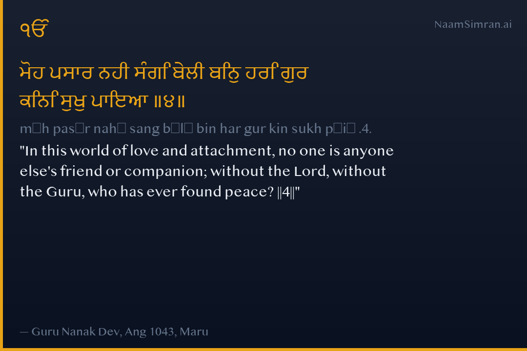 ਮੋਹ ਪਸਾਰ ਨਹੀ ਸੰਗਿ ਬੇਲੀ ਬਿਨੁ ਹਰਿ ਗੁਰ ਕਿਨਿ ਸੁਖੁ ਪਾਇਆ ॥੪॥