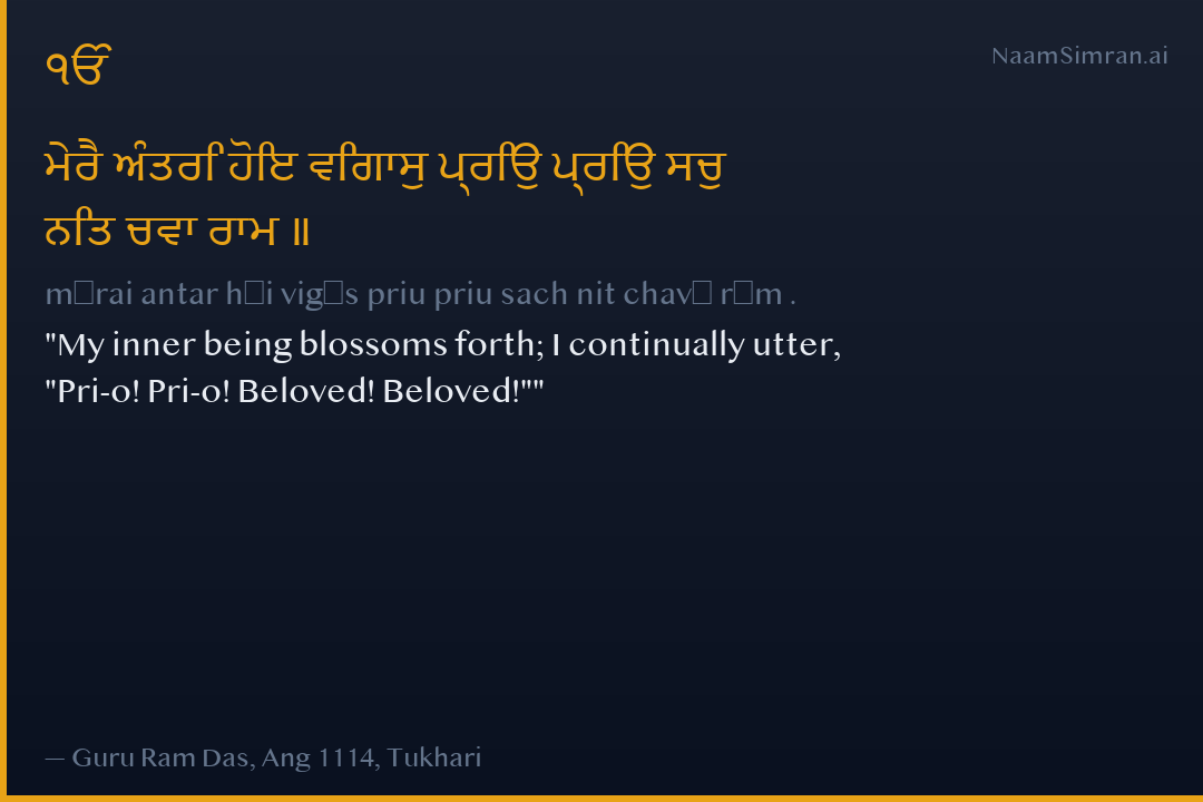 ਮੇਰੈ ਅੰਤਰਿ ਹੋਇ ਵਿਗਾਸੁ ਪ੍ਰਿਉ ਪ੍ਰਿਉ ਸਚੁ ਨਿਤ ਚਵਾ ਰਾਮ ॥