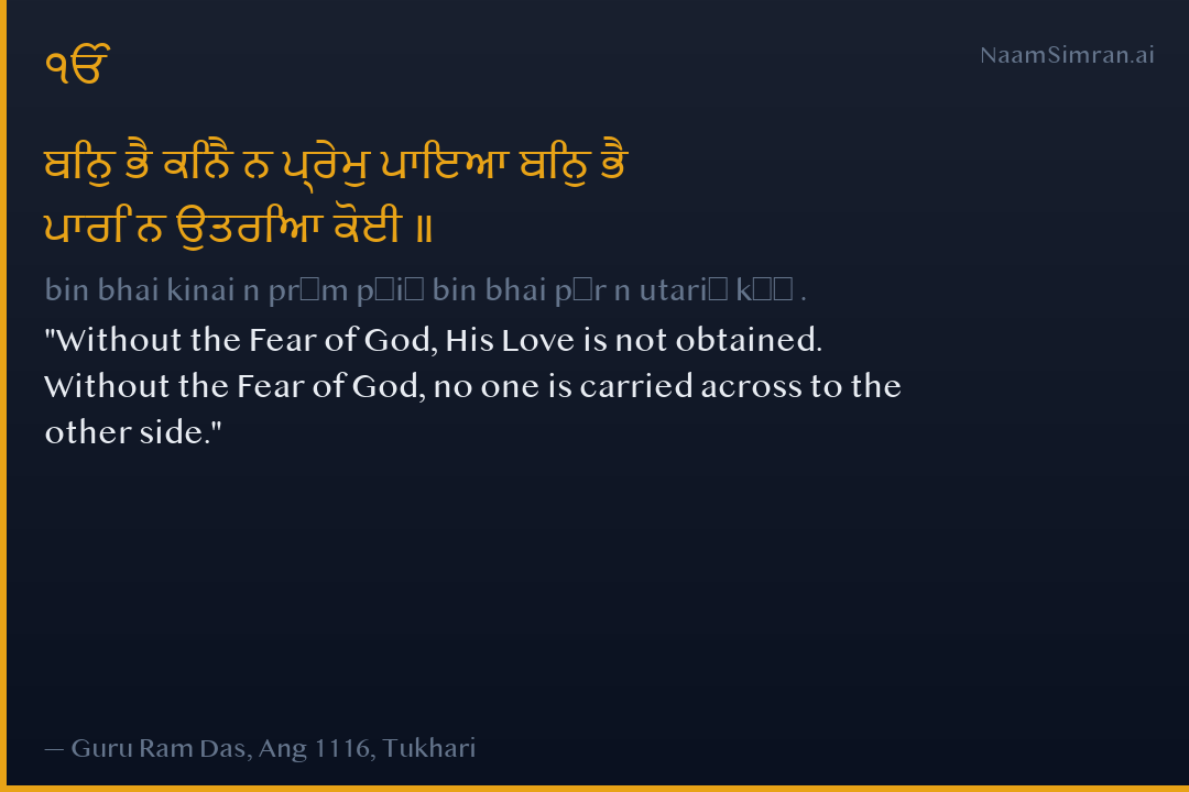 ਬਿਨੁ ਭੈ ਕਿਨੈ ਨ ਪ੍ਰੇਮੁ ਪਾਇਆ ਬਿਨੁ ਭੈ ਪਾਰਿ ਨ ਉਤਰਿਆ ਕੋਈ ॥