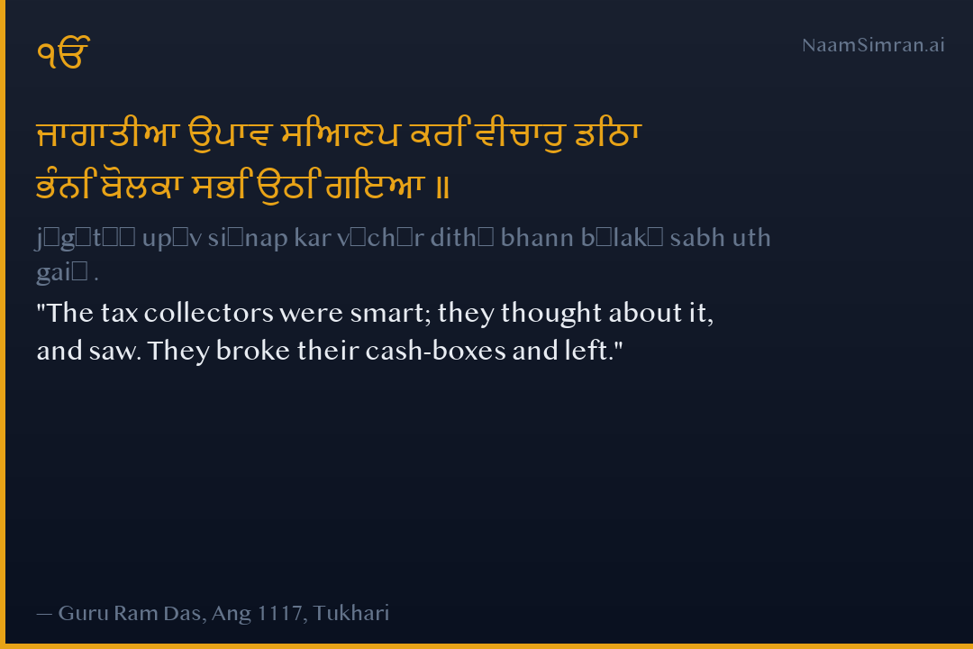 ਜਾਗਾਤੀਆ ਉਪਾਵ ਸਿਆਣਪ ਕਰਿ ਵੀਚਾਰੁ ਡਿਠਾ ਭੰਨਿ ਬੋਲਕਾ ਸਭਿ ਉਠਿ ਗਇਆ ॥