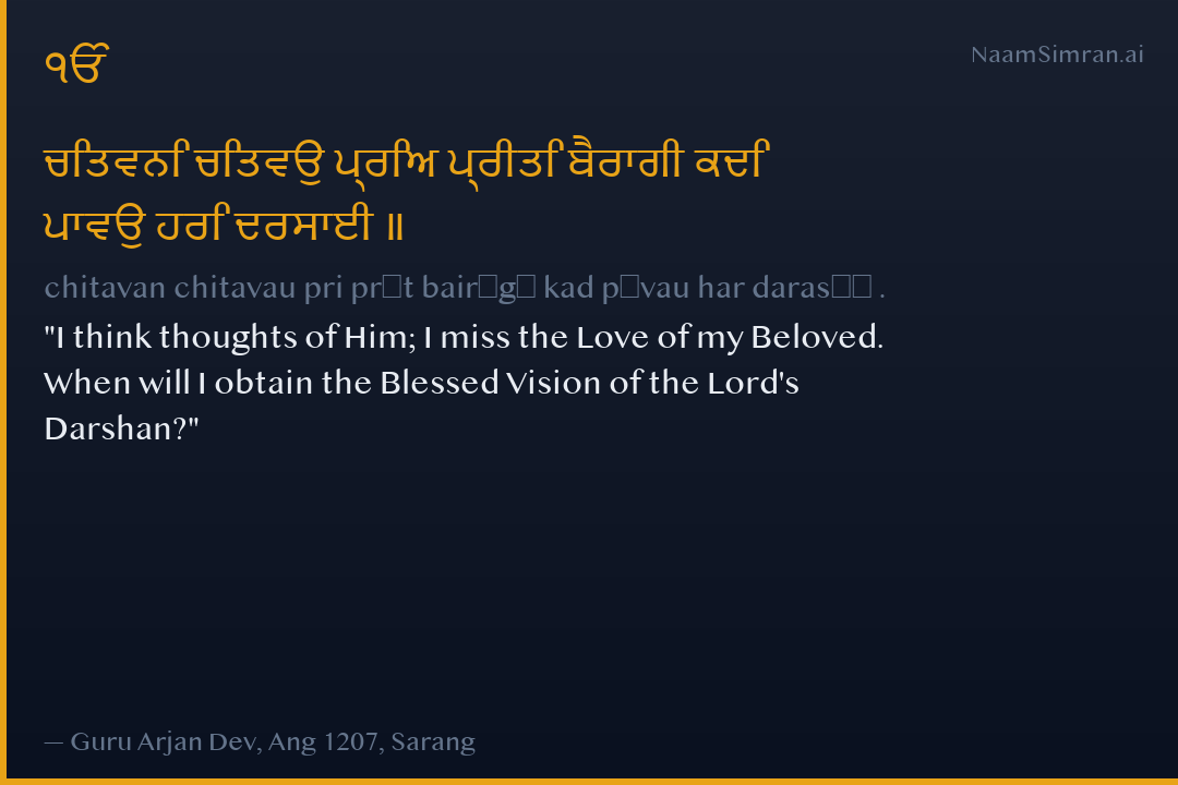 I think thoughts of Him; I miss the Love of my Beloved. When will I obtain the Blessed Vision of the Lord's Darshan?
