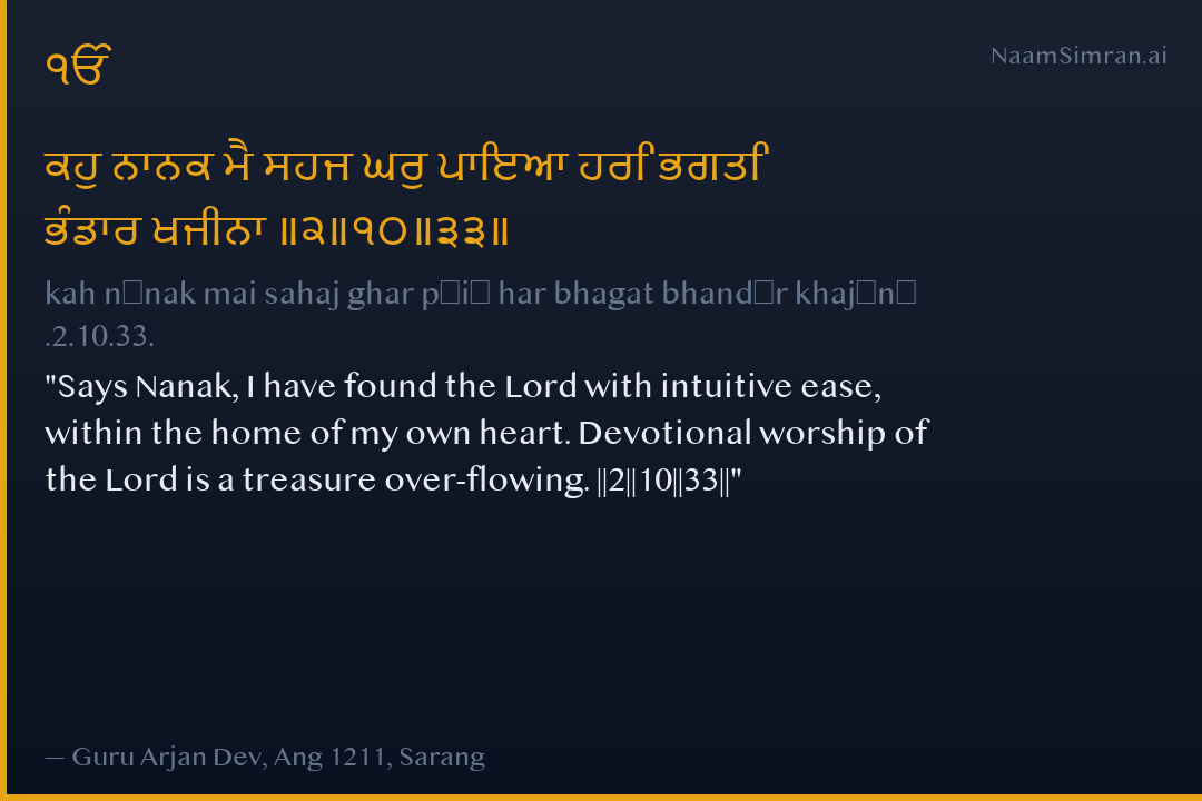 ਕਹੁ ਨਾਨਕ ਮੈ ਸਹਜ ਘਰੁ ਪਾਇਆ ਹਰਿ ਭਗਤਿ ਭੰਡਾਰ ਖਜੀਨਾ ॥੨॥੧੦॥੩੩॥