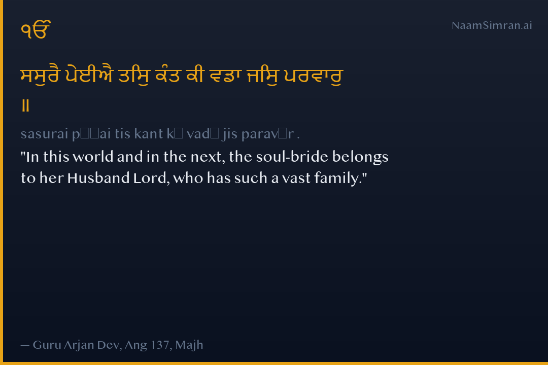 ਸਸੁਰੈ ਪੇਈਐ ਤਿਸੁ ਕੰਤ ਕੀ ਵਡਾ ਜਿਸੁ ਪਰਵਾਰੁ ॥
