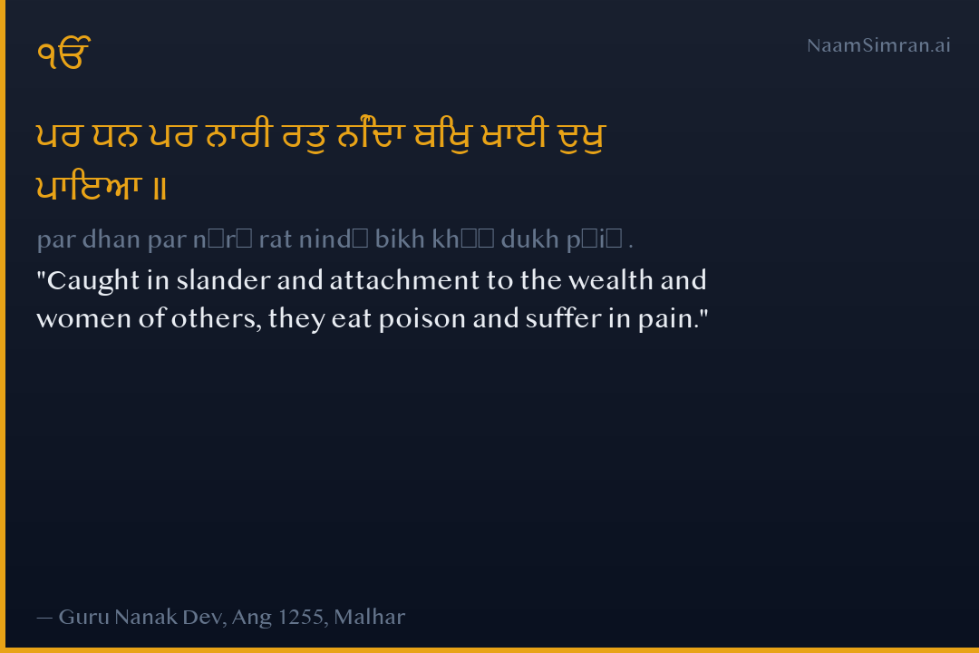 ਪਰ ਧਨ ਪਰ ਨਾਰੀ ਰਤੁ ਨਿੰਦਾ ਬਿਖੁ ਖਾਈ ਦੁਖੁ ਪਾਇਆ ॥