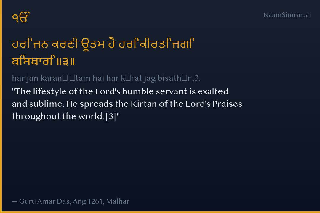 ਹਰਿ ਜਨ ਕਰਣੀ ਊਤਮ ਹੈ ਹਰਿ ਕੀਰਤਿ ਜਗਿ ਬਿਸਥਾਰਿ ॥੩॥