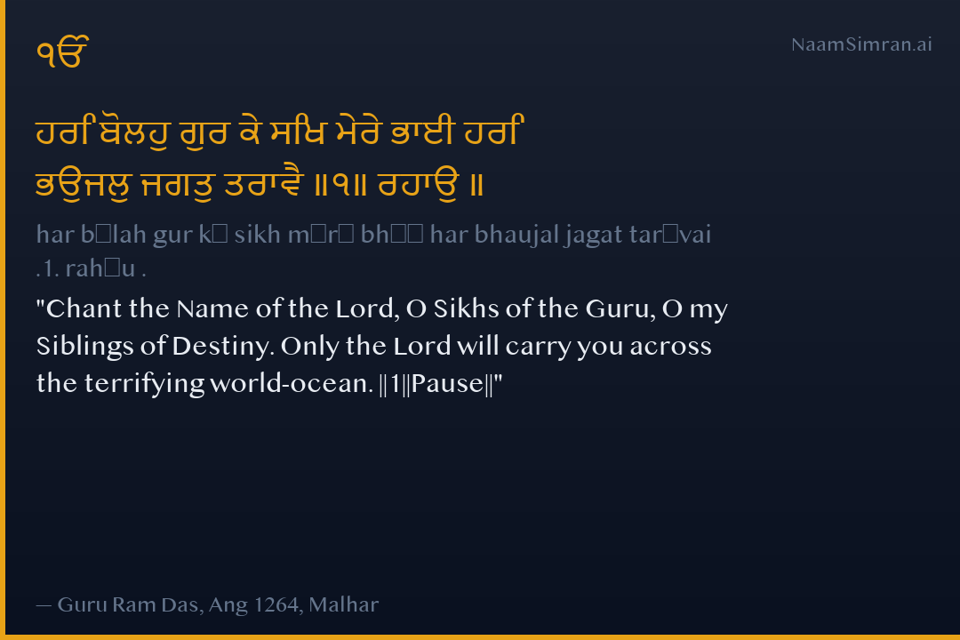 Chant the Name of the Lord, O Sikhs of the Guru, O my Siblings of Destiny. Only the Lord will carry you across the terrifying world-ocean. ||1||Pause||