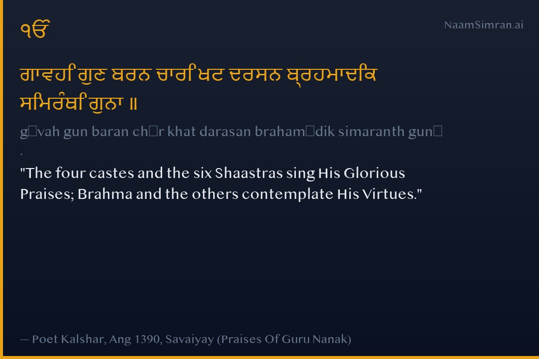 ਗਾਵਹਿ ਗੁਣ ਬਰਨ ਚਾਰਿ ਖਟ ਦਰਸਨ ਬ੍ਰਹਮਾਦਿਕ ਸਿਮਰੰਥਿ ਗੁਨਾ ॥