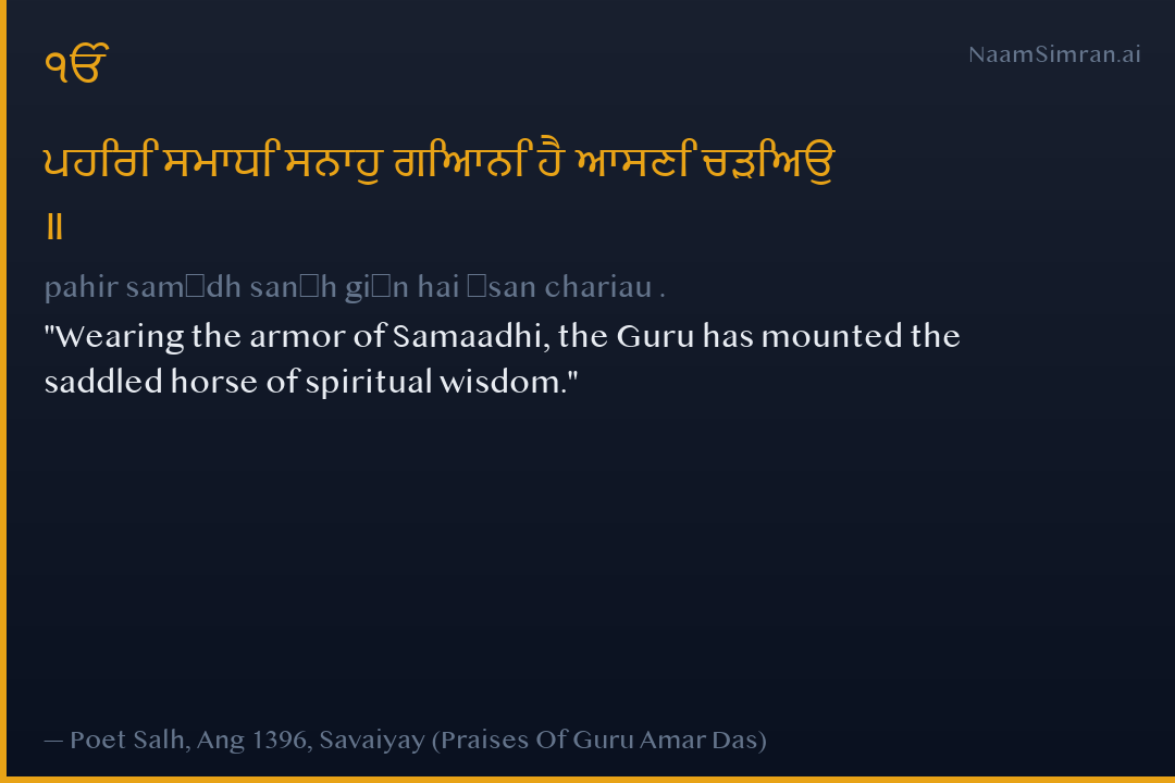 ਪਹਿਰਿ ਸਮਾਧਿ ਸਨਾਹੁ ਗਿਆਨਿ ਹੈ ਆਸਣਿ ਚੜਿਅਉ ॥