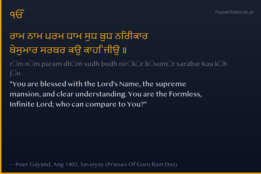rām nām param dhām sudh budh nirīkār bēsumār sarabar kau kāh jīu .