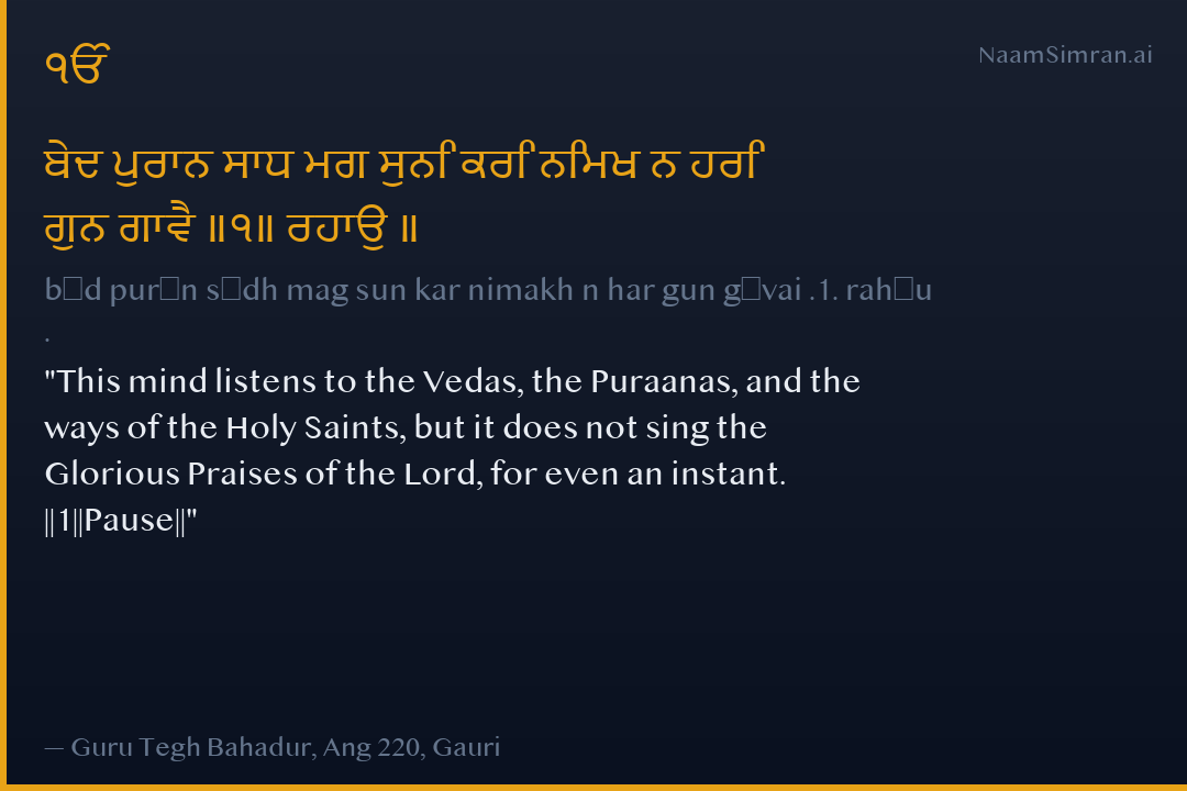 This mind listens to the Vedas, the Puraanas, and the ways of the Holy Saints, but it does not sing the Glorious Praises of the Lord, for even an instant. ||1||Pause||