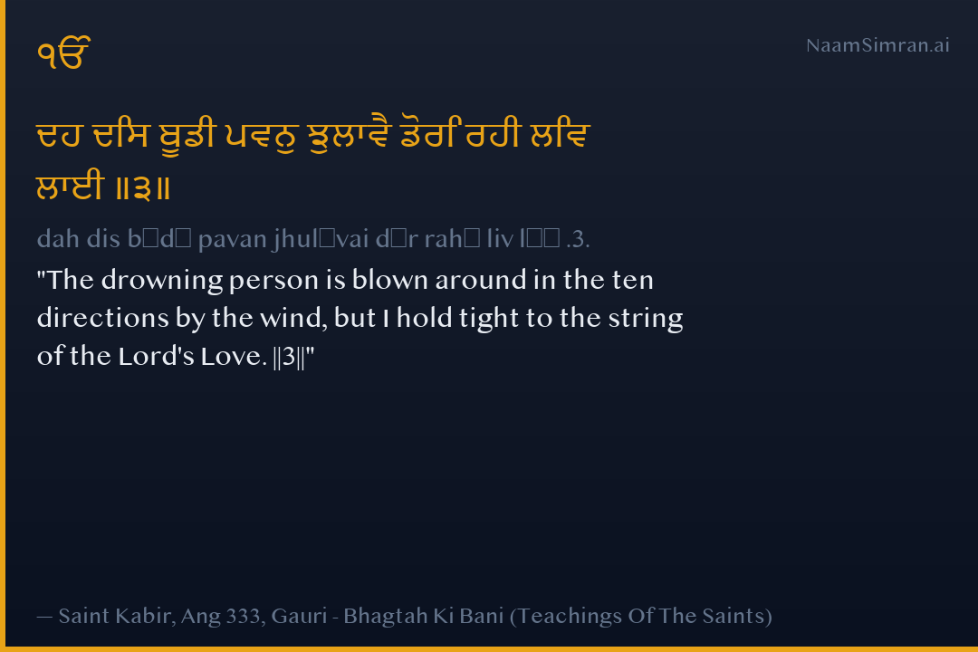 The drowning person is blown around in the ten directions by the wind, but I hold tight to the string of the Lord's Love. ||3||