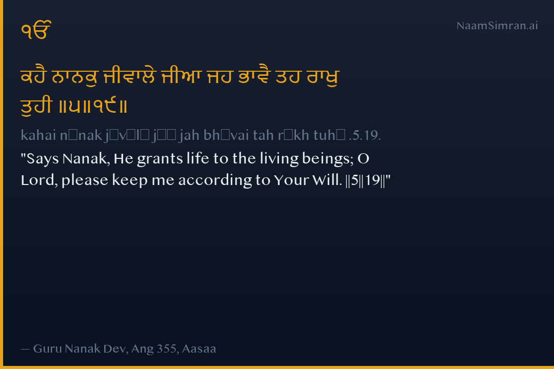 kahai nānak jīvālē jīā jah bhāvai tah rākh tuhī .5.19.